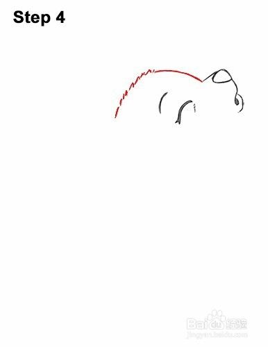 第4步:从狼的小口开始,在眼睛上方画一条曲线,并在头部的前方画眉。然后在左边画一条由短冲程组成的曲线,以便头部毛茸茸的顶部。注意这些线与闭眼之间的距离。