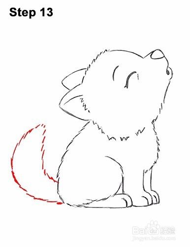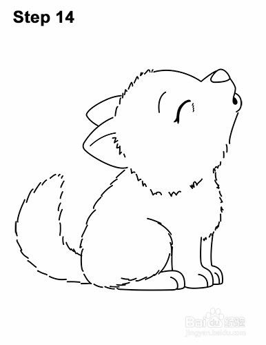 第13步:画出一条长而弯曲的虚线,从狼体尾部的身体左侧开始。尾巴的底部应该狭窄,中间粗和尖尖尖。
