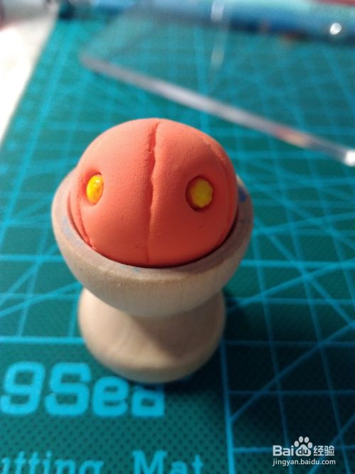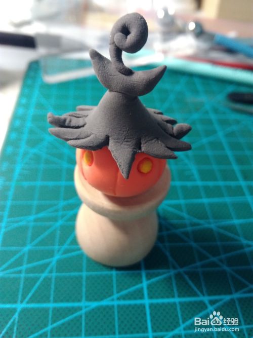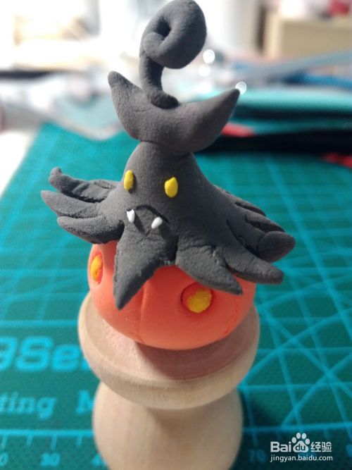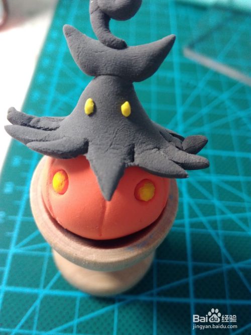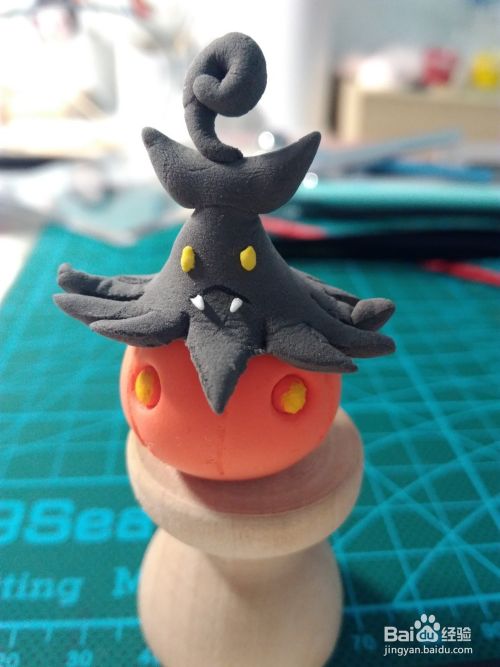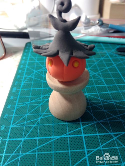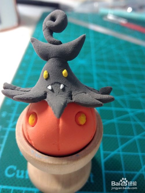 然后黄色粘土做眼睛,黑色粘土做嘴唇,白色粘土做尖牙,将形象完善好,南瓜灯精就做好了