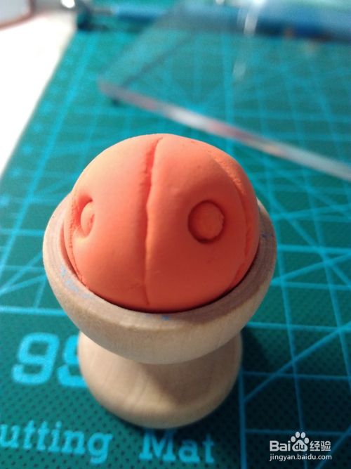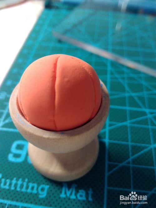 先取橘红色粘土,搓成一个球,然后划出竖着的几道纹,做出南瓜的样子