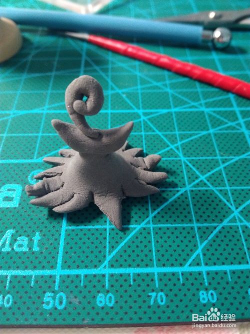 然后再取粘土搓成条,一端内卷,做成顶部的蔓状