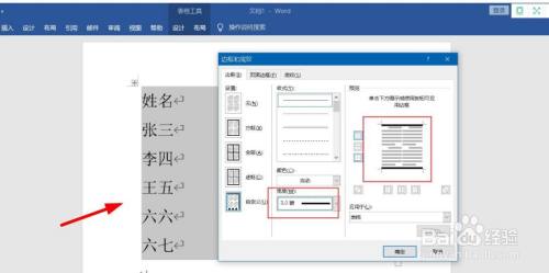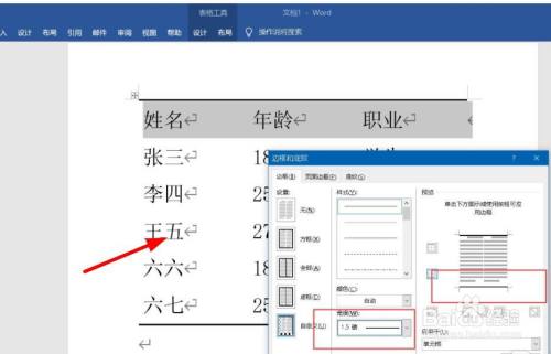 3接着,选中整个表格,点击菜单栏上“设计-页面边框”,在打开的对话框里选择“边框”界面,在宽度位置选择粗的线条,并点击预览框里的上下两边,添加粗线