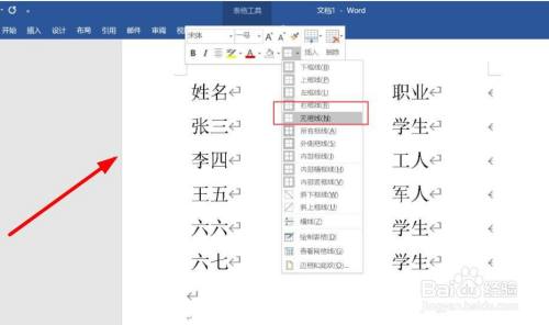 2然后,在表格内输入文字内容,选中表格,点击菜单栏上“开始-菜单-边框”,下拉选择无边框,去除表格的框线。