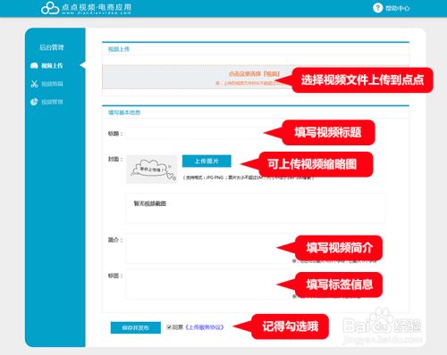 进入点点视频后台,点击左侧蓝色导航栏,点击【视频上传】。