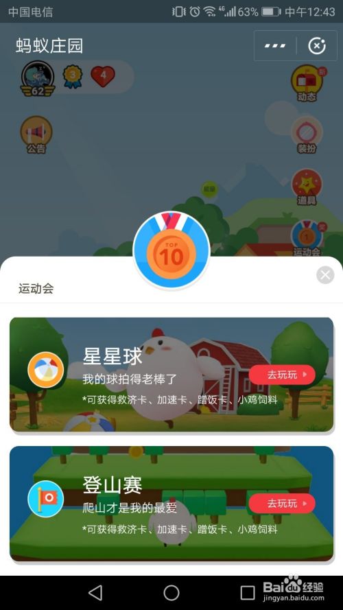 点击蚂蚁庄园右侧的“运动会”,再点击“登山赛”,进入游戏后,点击“开始游戏”,通过左右滑动手机屏幕,控制小鸡左右移动让它不要撞上树,并且吃到金币即可得分,如果撞上树则游戏终止,达到一定的分数线对应得到相应宝箱,分数达到1500即可开启全部宝箱,有机会获得加速卡、蹭吃卡、救济卡或者饲料。