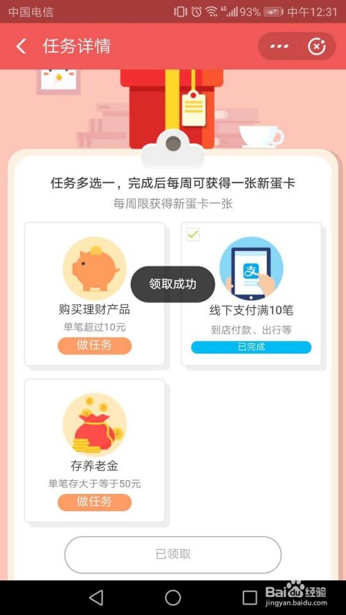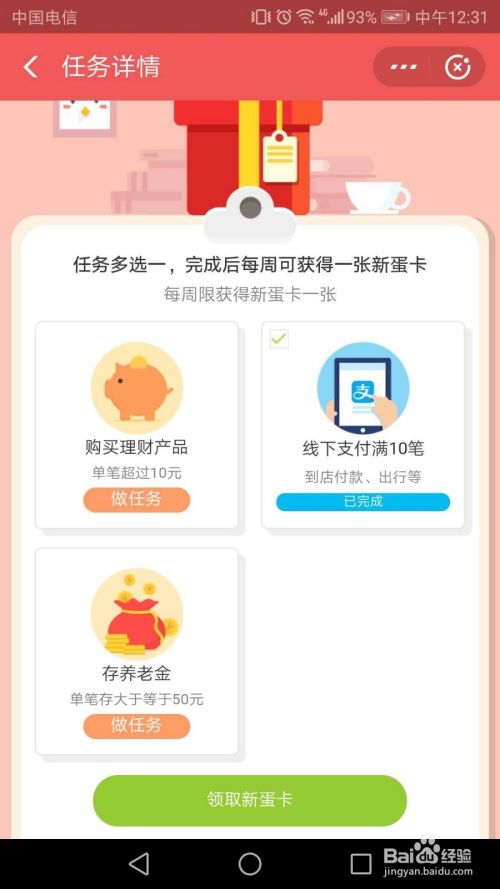 点击蚂蚁庄园右侧的“道具”,点击新蛋卡下面的“查看任务”,购买理财产品(单笔大于100)、线下支付满十笔、存养老金(单笔大于50)玩家可任意选择其中一个任务完成,完成的即显示领取新蛋卡,点击领取即可。