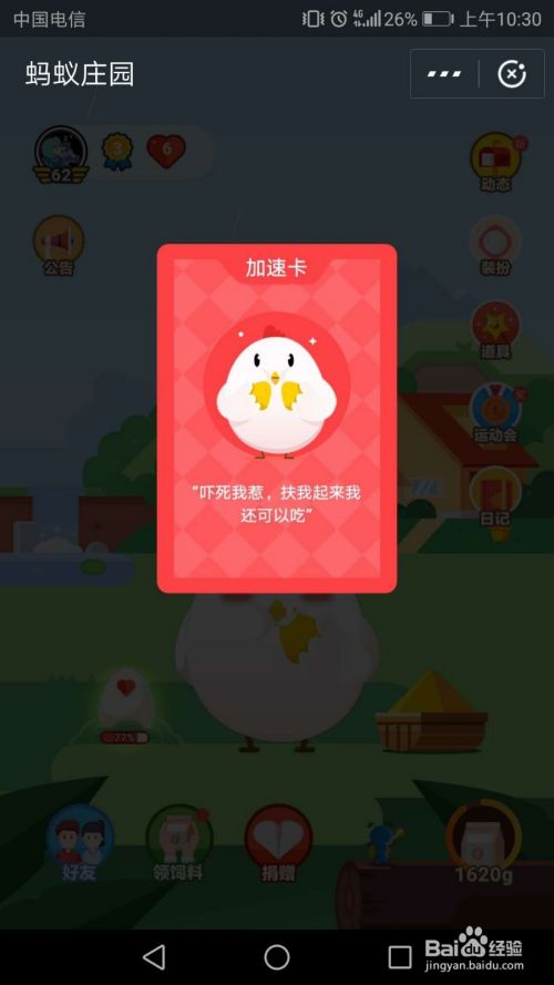 加速卡只能在自己的庄园使用,在自家庄园给小鸡喂饲料之后,点击道具里的加速卡,小鸡进食时间即可缩短一小时,每次只能使用一张加速卡(下图4-6)。