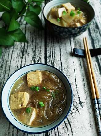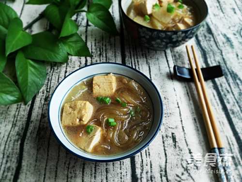 10分钟左右,粉条炖烂,豆腐炖透成蜂窝状,就熟了