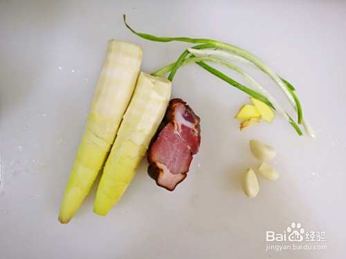 准备春笋2个,腊肉一块,葱、姜、蒜适量