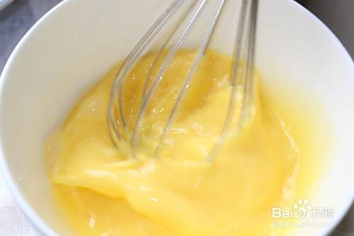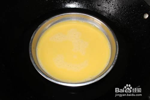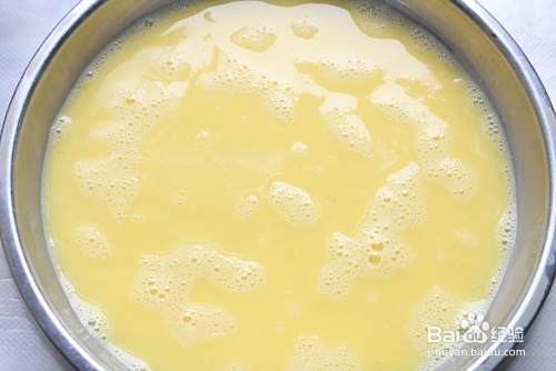 鸡蛋三个打入碗中,用手动打蛋器搅匀,倒入盘子中(盘子底部要抹上少许植物油)。
