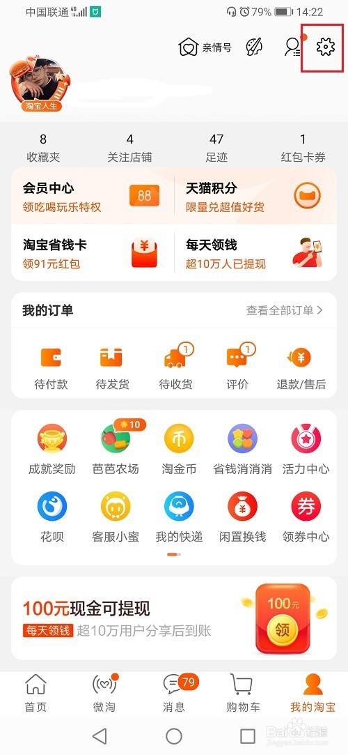 第一步打开手机淘宝,进去我的界面,点击设置