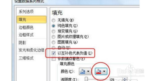 双击图表中的数据系列,弹出“设置数据系列格式”对话框,选择“填充”。在右侧区域中选择“纯色填充”,并勾选“以互补色代表负值”。这时下部的“填充颜色”区域中会增加一个颜色选择按钮,单击右侧的颜色选择按钮选择一种颜色,如红色,然后关闭对话框。