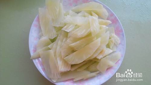 用刀倾斜切成薄薄的生菜片,厚度要均匀。