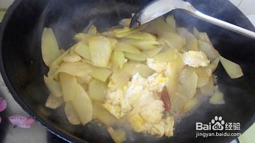 加入适量的盐和味极鲜后将鸡蛋倒进去翻炒。