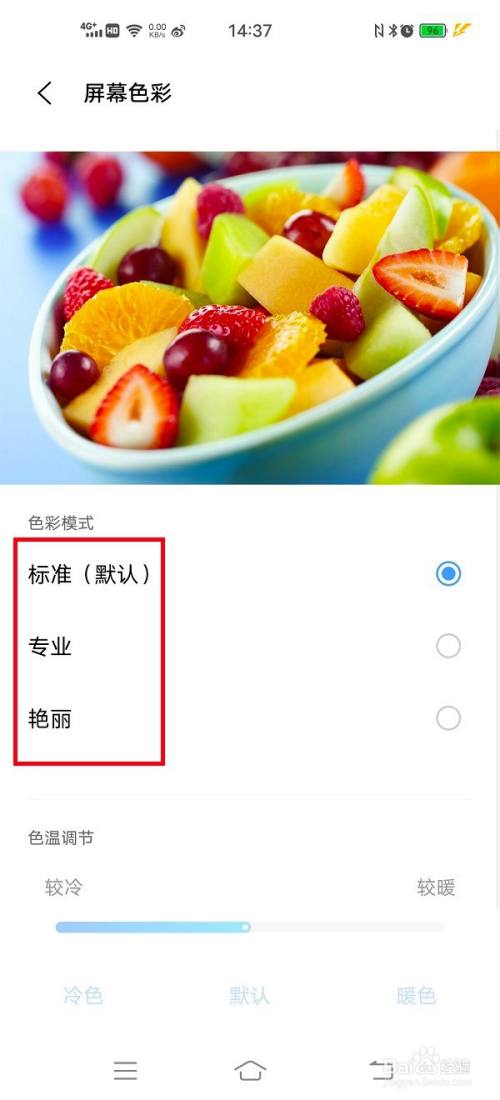 点击“屏幕色彩”进入设置,在“屏幕色彩”页共有三个选项:标准、专业和艳丽,你喜欢哪个,点击后面的圆圈就可以了。
