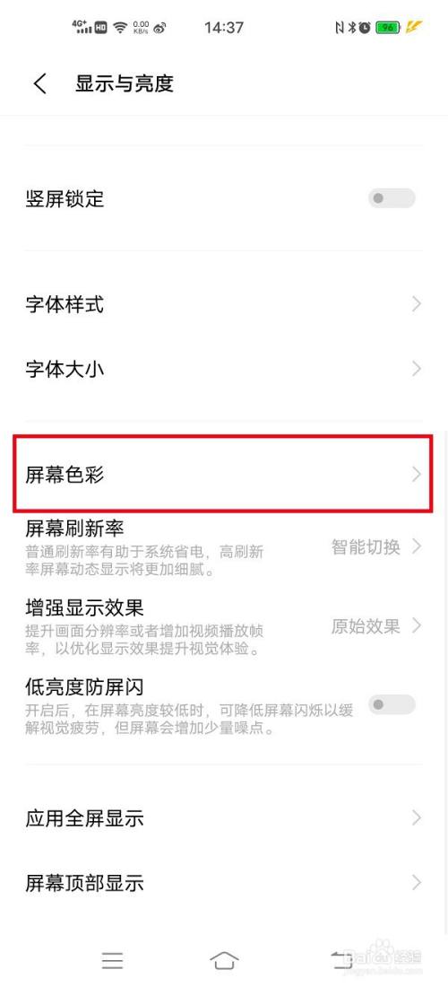 在“显示与亮度”页面用手指滑动,找到“屏幕色彩”选项。