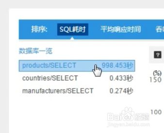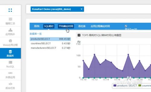 点击数据库模块,首先看到数据库一览列表,在这里显示当前应用所有的SQL操作,并且支持包括按耗时、平均响应时间、吞吐率、应用过程响应时间的多种排序方式。