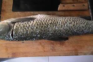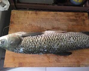 取腥线(也可不做,煮的时间久了,鱼腥味也能去除)。在鱼头下部和鱼尾上部各划一刀。