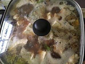 煮开后,将炒锅里的鱼和汤全部倒入火锅中,放入豆腐,金针菇,煮20~30分钟。