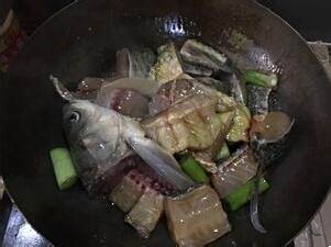 炒锅中放油,烧热,将鱼等放入,炒一下。如果要吃辣的,油热后放入火锅底料,熬化,再放入鱼,炒一下。