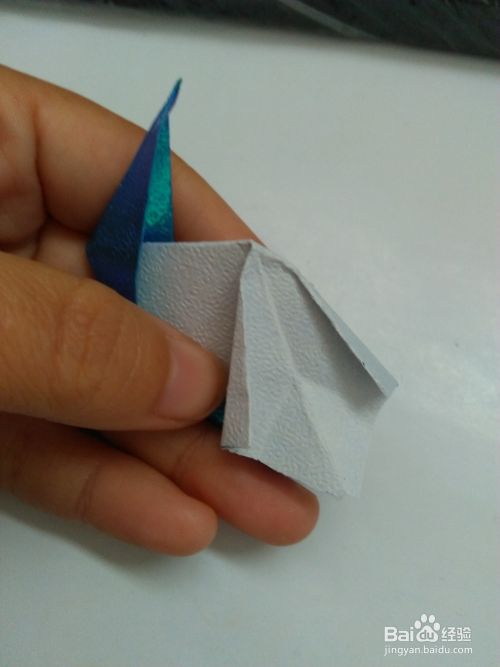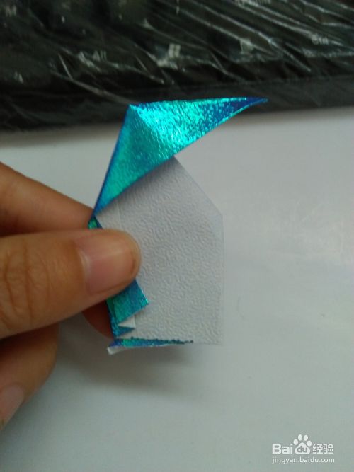 按照折痕把角折进企鹅的腹部,把里侧的角向外拉。
