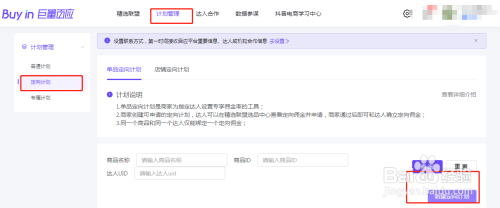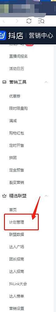 点击营销模块之后在左侧工具栏精选联盟下找到计划管理点击进入