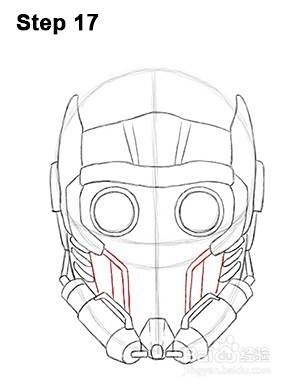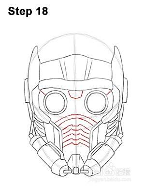 第18步:画出在他嘴边的Star-Lord头盔的中间部分。首先画出两条连接右眼下方头盔侧面的曲线。然后在他们的下方添加一系列五角形线,并朝向头盔的底部。在顶部的眼睛之间增加另一条斜线。