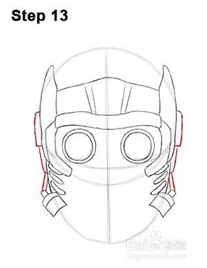 第17步:现在将Star-Lord头盔两侧的内部画成两条向下弯曲的线。添加更多垂直线以获得更多细节。