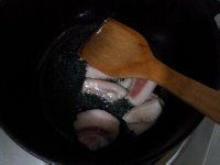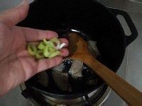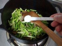 放入蒜苔加入盐,煸炒到闻到菜味没有生蒜味就立即出锅。