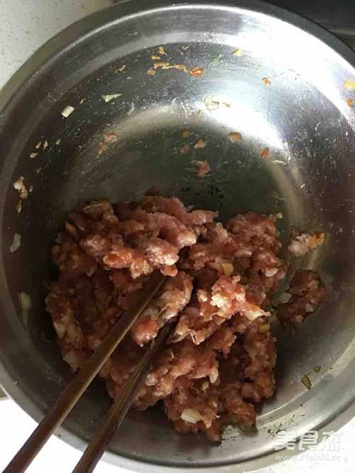 五花肉切碎,家加入葱姜沫,料酒,生抽,盐搅拌均匀,腌制30分钟备用!