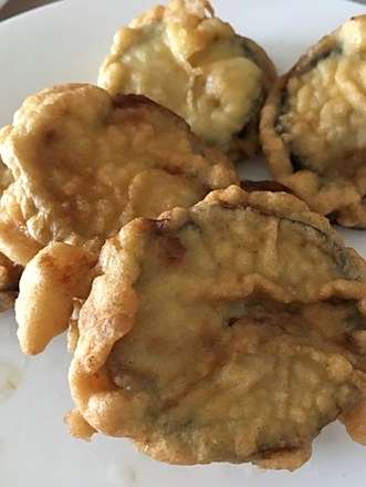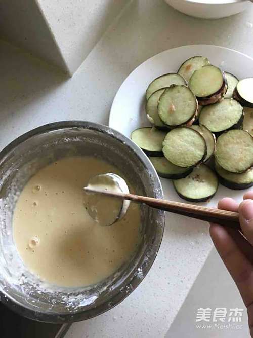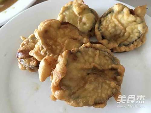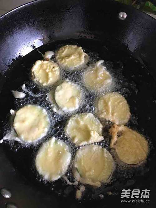 茄盒挂上面糊,封住开口的地方,准备炸!