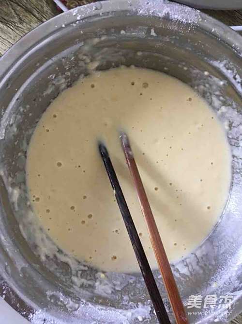 面粉中加入两个鸡蛋,加少量水,打均匀,别太稀!