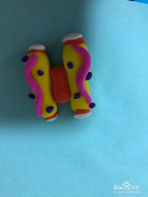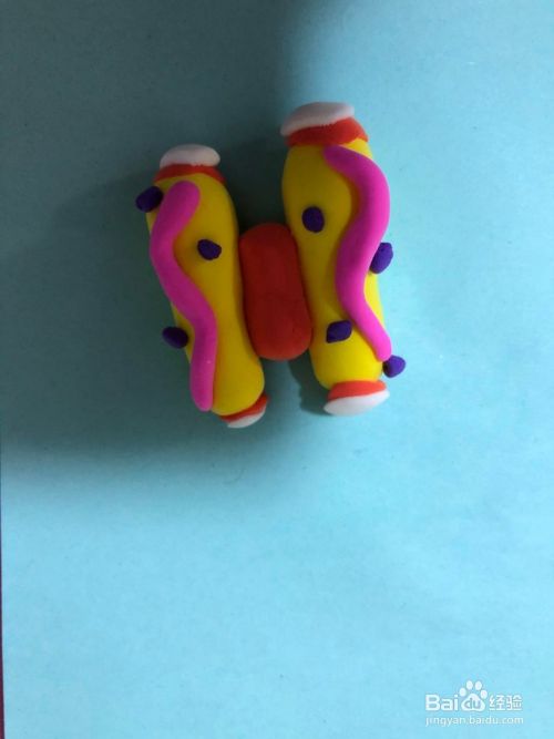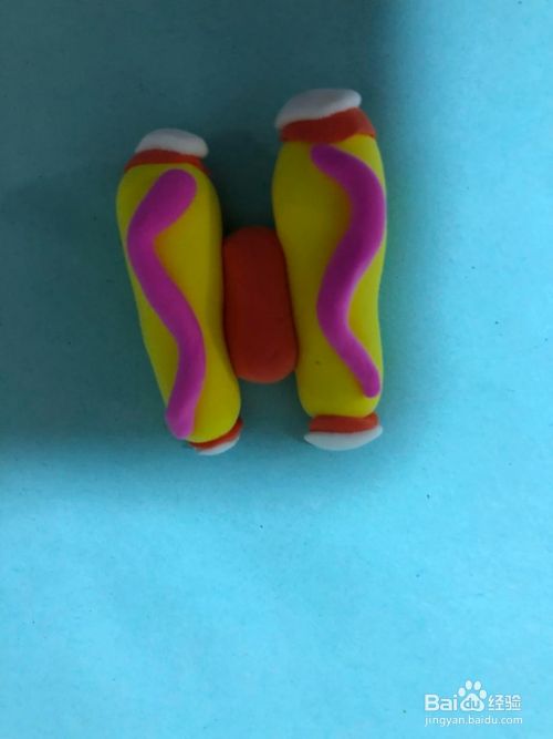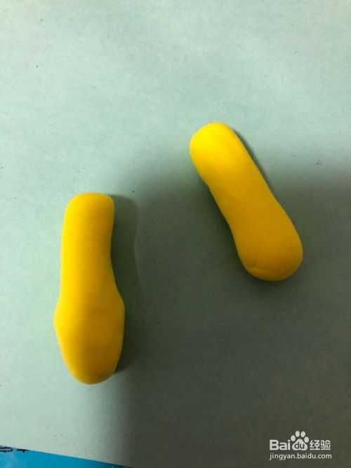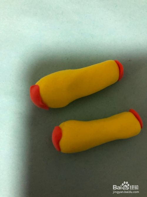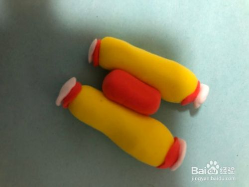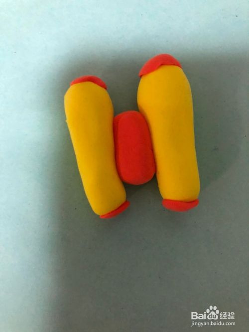 拿出黄色的彩泥揉成两个成条,在拿出红色的彩泥揉成四个圆形按扁。