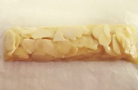 拿出冷冻好的杏仁馅切片成0.3公分,切片的时候注意不要太贪心哦,高度不要高过糯米船,不然馅料会溢出来。
