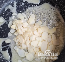 糖浆煮好,关火,趁热倒入准备好的杏仁片。