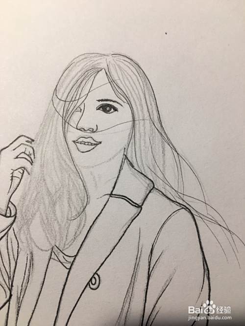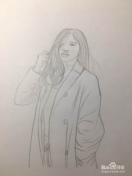 使用铅笔在白纸上画女孩的初稿线描稿。
