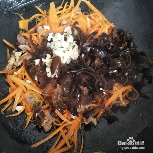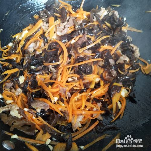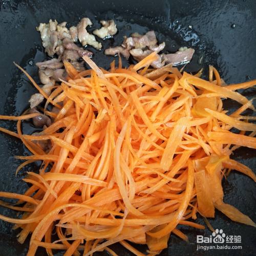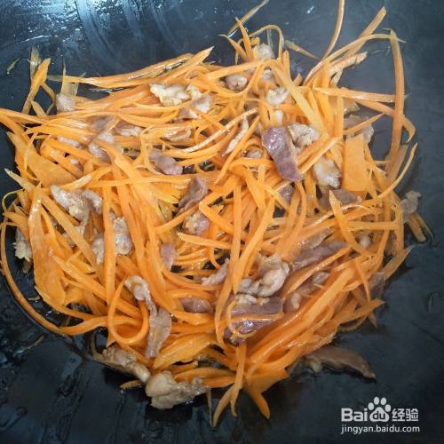 瘦肉炒好后再倒入胡萝卜丝一起翻炒。