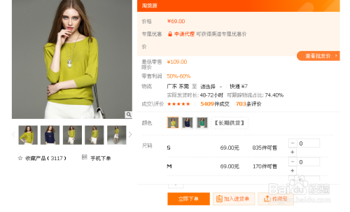在代销市场中找到你喜欢的宝贝,点击进入,就会看到“立刻下单”、“加入进货单”、“传淘宝”三个按钮,如下图。