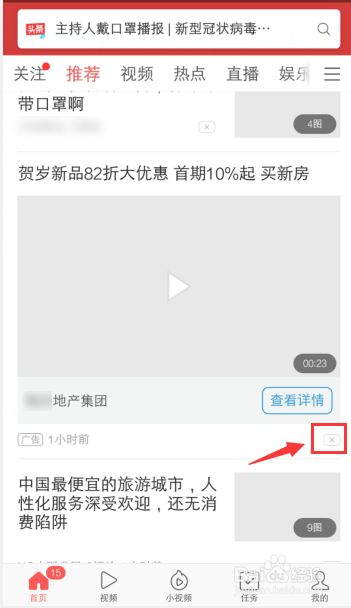 2、在今日头条极速版页面,点击一条广告下方的“x”。