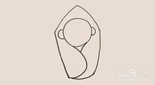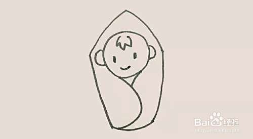 婴儿头外面,先画上一个尖尖的形状,下面画上一个方形作为襁褓的外形。