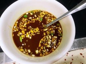 准备一个碗,倒入两勺生抽,一勺老抽,一勺蚝油,两勺淀粉,一勺盐,两勺糖,准备的蒜沫,加入适量的清水,调制好酱汁
