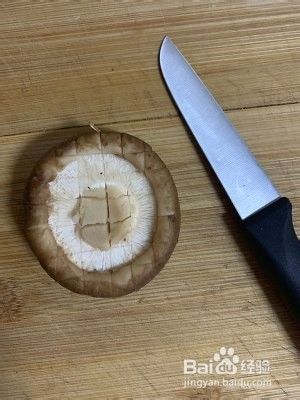把香菇切成十字装,但是刀不要切到底,避免香菇切断