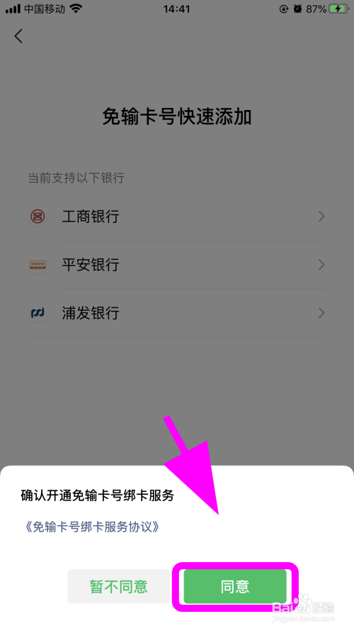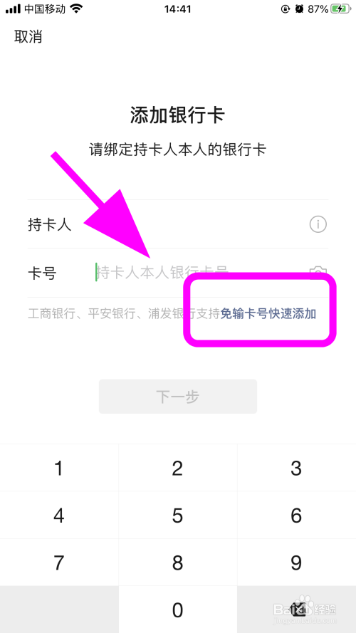 认证通过跳转添加银行卡页面,点击【免输卡号快速添加】;