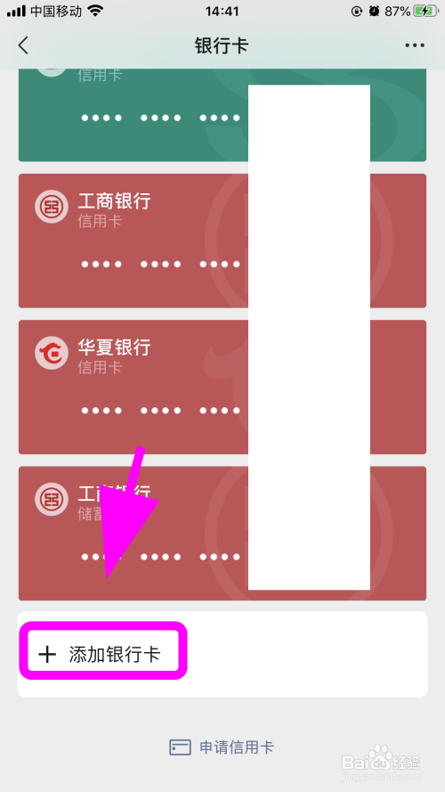 进入银行卡列表,点击底部的【添加银行卡】;