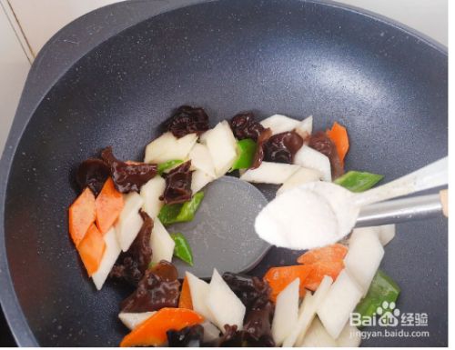 大概翻炒两分钟左右,放入适量的盐,根据自身口味添加哦!