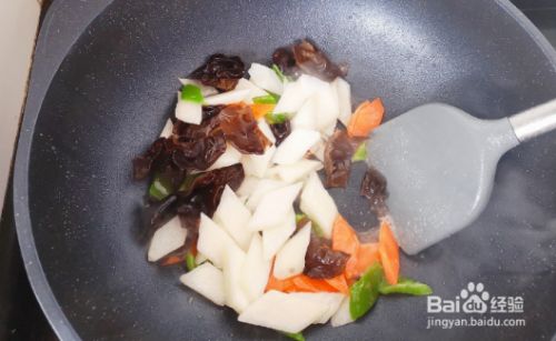 另起锅倒入适量的油,将山药、胡萝卜片、木耳和青椒一起倒入韩国VCC气垫锅进行翻炒,这里说的是,这个气垫锅是不粘锅,炒菜烧汤都是不错的哦