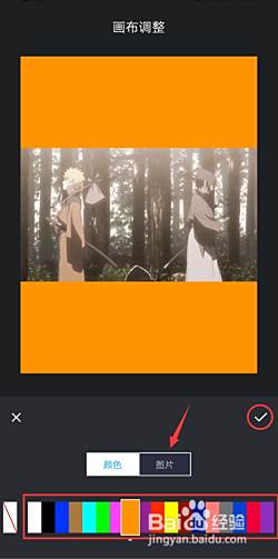 弹出新的页面后,点击喜欢的颜色可为视频添加纯色背景。点击“图片”功能,跳转至图片选择页面,点击需要的图片为视频添加图片编辑。设置完成后点击“√”。