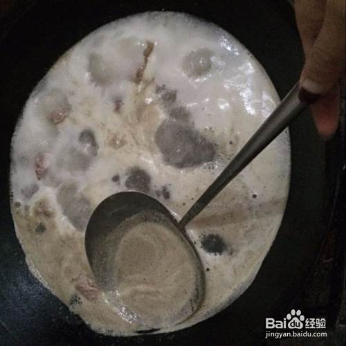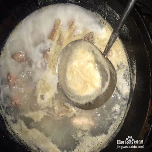 放入排骨后水再次沸腾开后关中火,撇去上面的白沫(这个过程是为了将排骨中的血沫、血腥味去除,让我们吃的更鲜美、干净)撇到差不多白沫