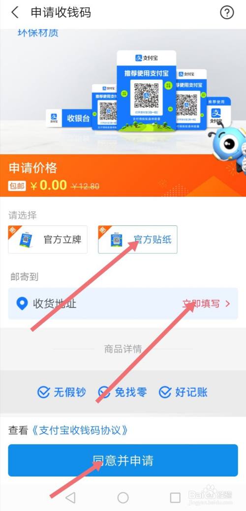 进入立即申领界面后,依次选择官方贴纸,填写收货地址,点击同意申领,即可免费申领个人的支付宝收款码贴纸。