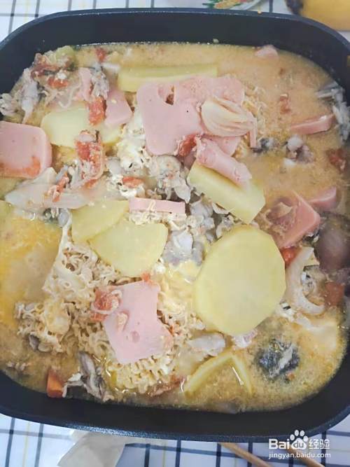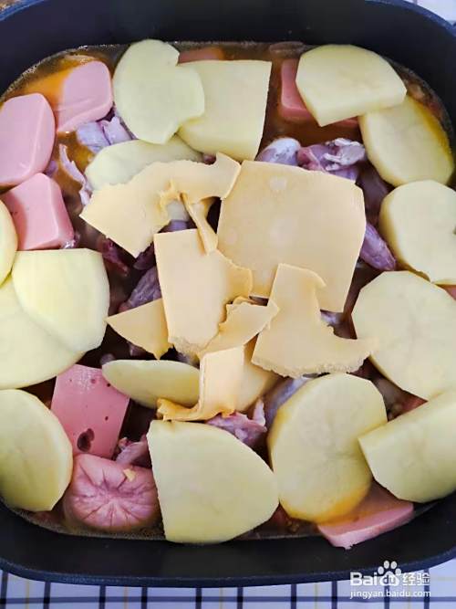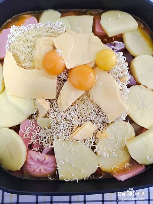 把方便面放在奶酪片上,然后铺上一层奶酪片。加鸡蛋
